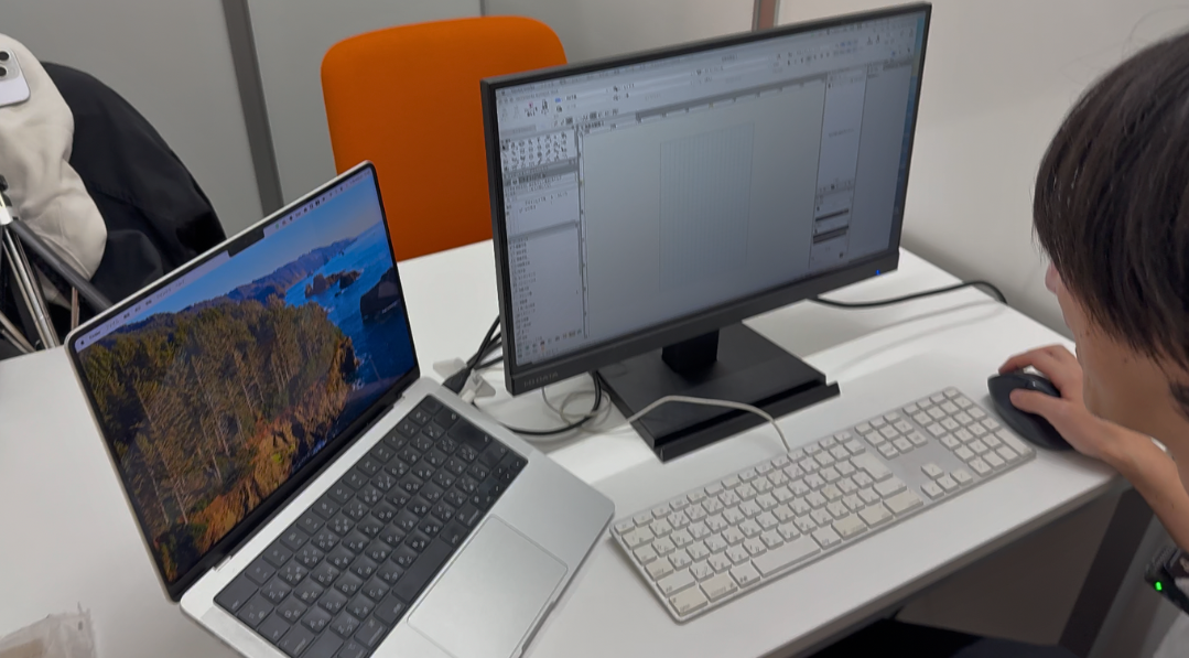 パソコンとモニターを使い、建築設計ソフト「VectorWorks」で図面を描いています。内装設計をする人の多くが使うソフトです。※Vectorworks:建築・デザイン・エンターテイメント業界などで使用される汎用CADソフトウェア