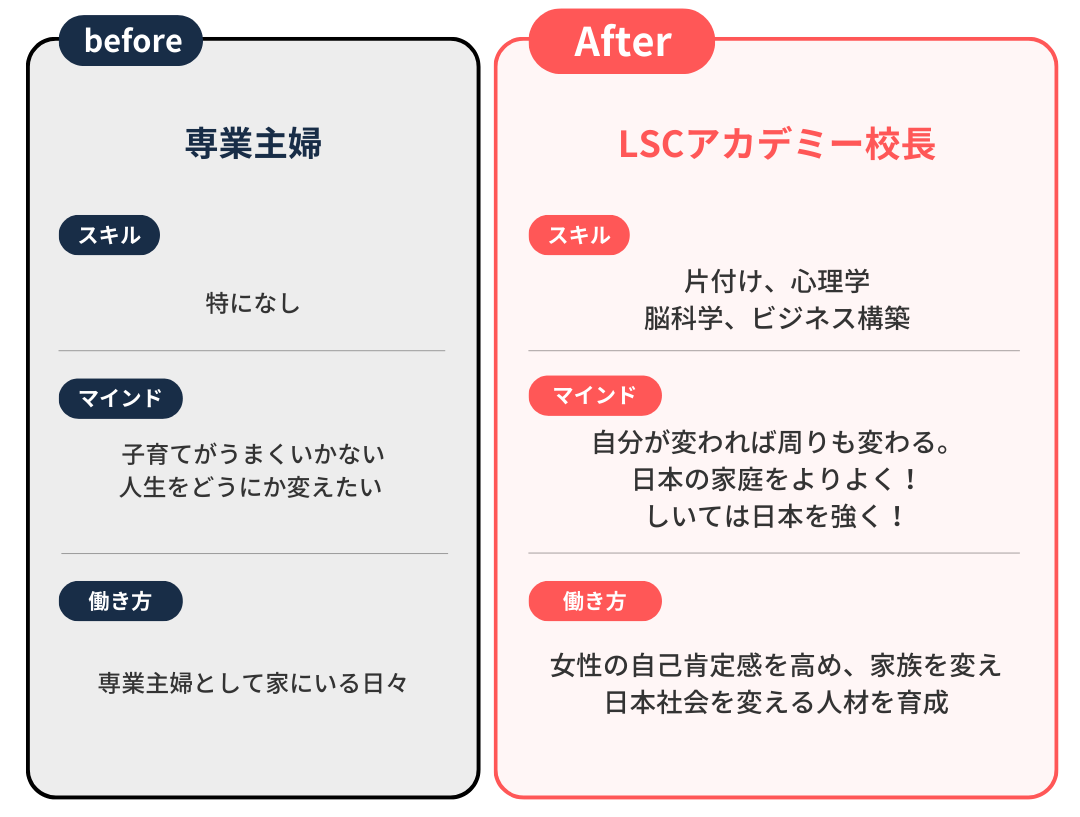 今では年商1億円のLSCアカデミーという女性のための学校を運営し、多くの女性たちの人生を変えるサポートをしています。