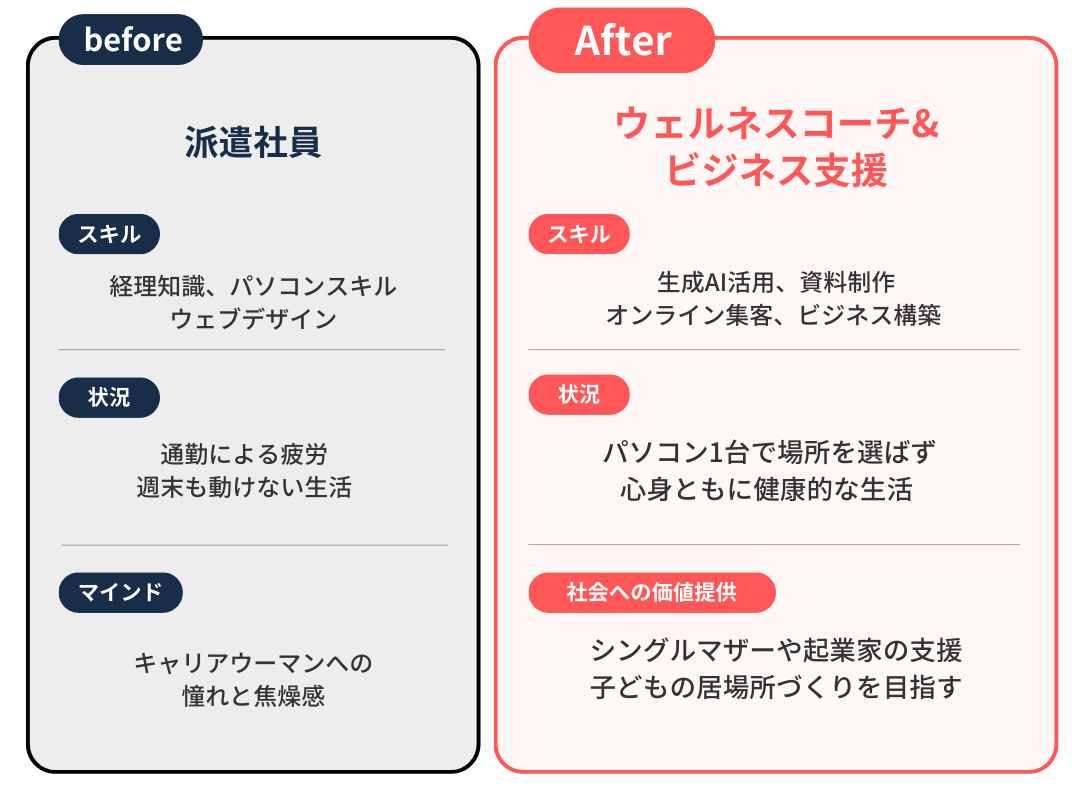 今はウェルネスコーチと生成AIコンサルタント、両方をやっています。AIで業務効率化して空いた時間で他のこともやる。これが私のスタイルです。